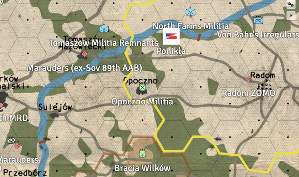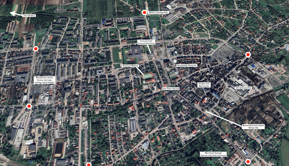 Since early September, when the Battle of Radom cut the Soviet line of communication between Lódz and Lublin, Opoczno has been hard at work to position itself as a regional trade center. There’s still a fair amount of concern about threats from marauders to the west, and a lot of the city’s limited military efforts have been designed to guard against the former Soviet airborne troops occupying Tomaszów Mazowiecki. Those guys have been oddly quiet since a reported large explosion and fire in August, though. The less organized marauders to the southwest, mostly splinters of the 9th Tank Division, have also been going dark over the past couple of months.