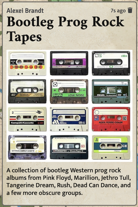 Janek hands over a scuffed cassette tape case. Alexei unzips the cover and whimpers as he inspects the labels. Then Janek unstraps a large, heavy, oblong package from his pack frame and, with a cautious glance around the alley, unwraps it. Alexei paws at the air, eyes bulging.